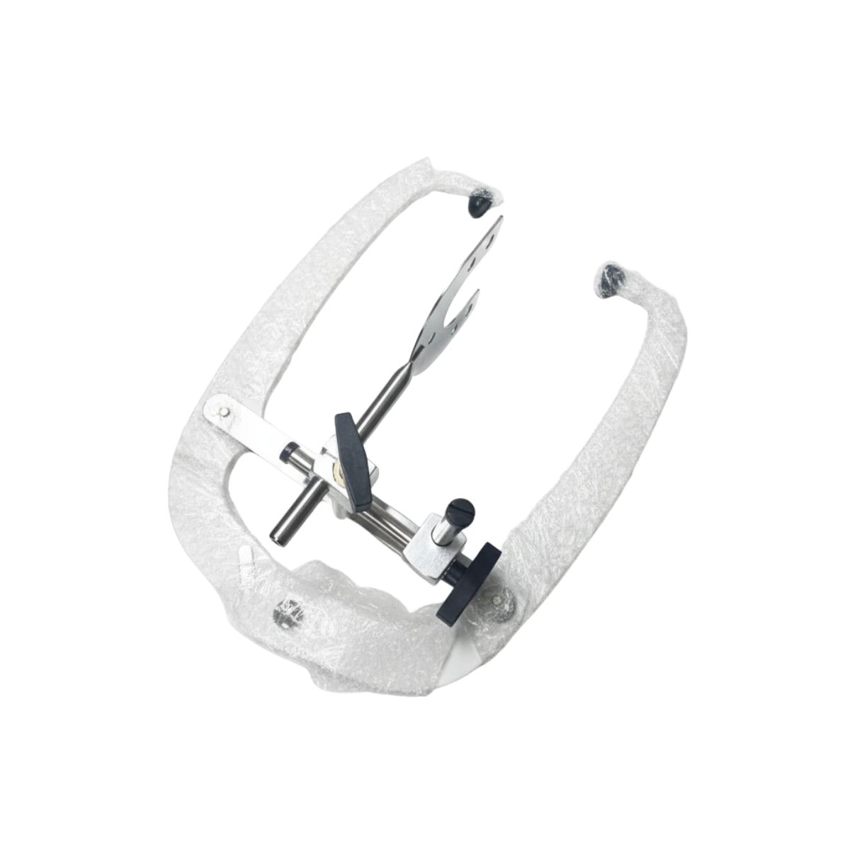 Relator de Nasión (Posicionador Infraorbitario): Es el brazo con apoyo plástico que se sitúa en el puente nasal. Es vital porque establece el «tercer punto» de apoyo, permitiendo que el modelo no solo esté centrado, sino correctamente inclinado en sentido vertical.