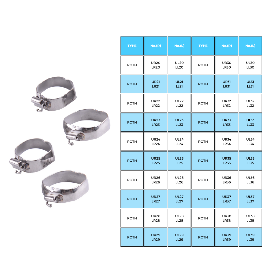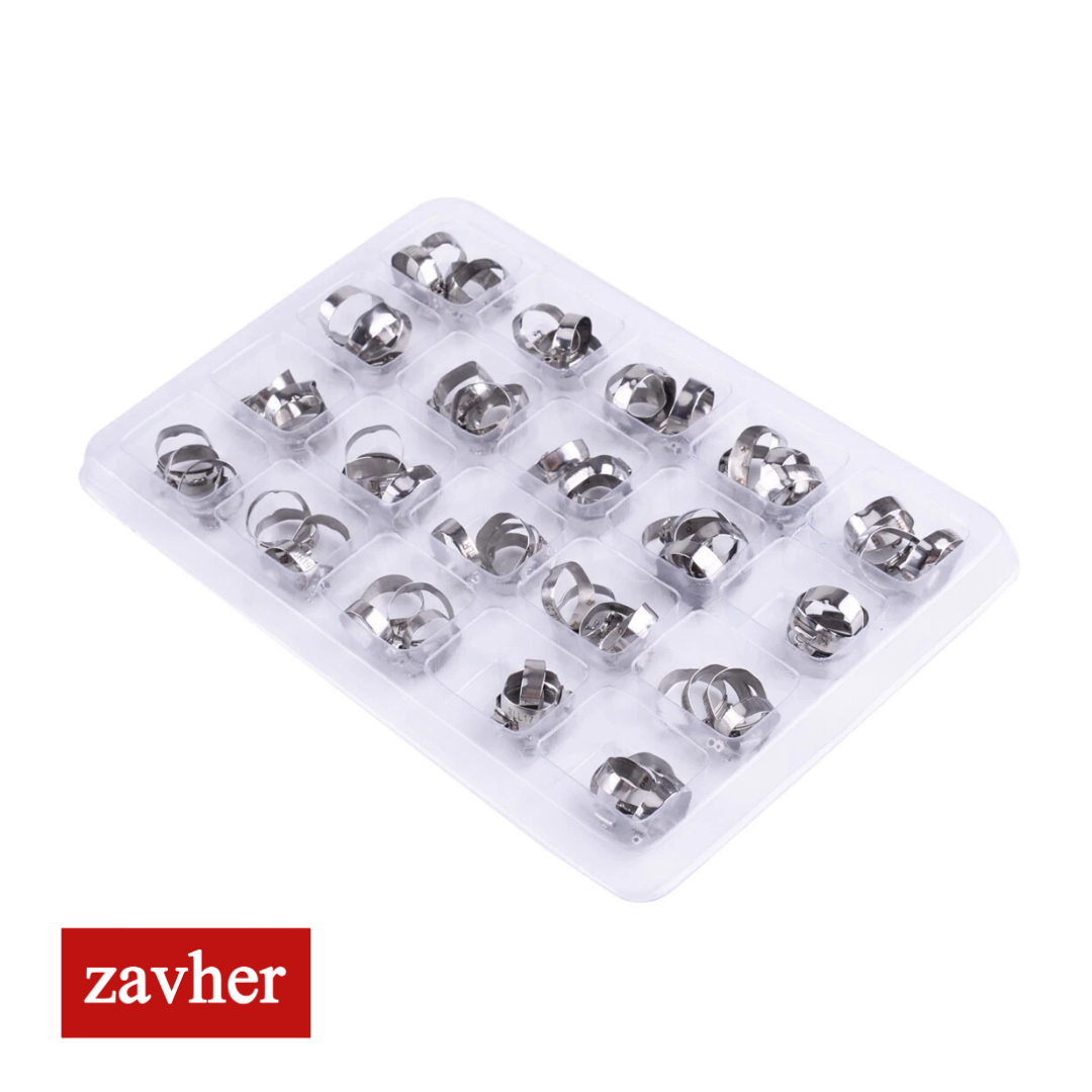 Las bandas son preformadas para adaptarse anatómicamente a la morfología de los molares, facilitando su colocación y asegurando una retención óptima. Están fabricadas en acero inoxidable de grado médico, lo que les confiere alta resistencia a la corrosión y durabilidad.
