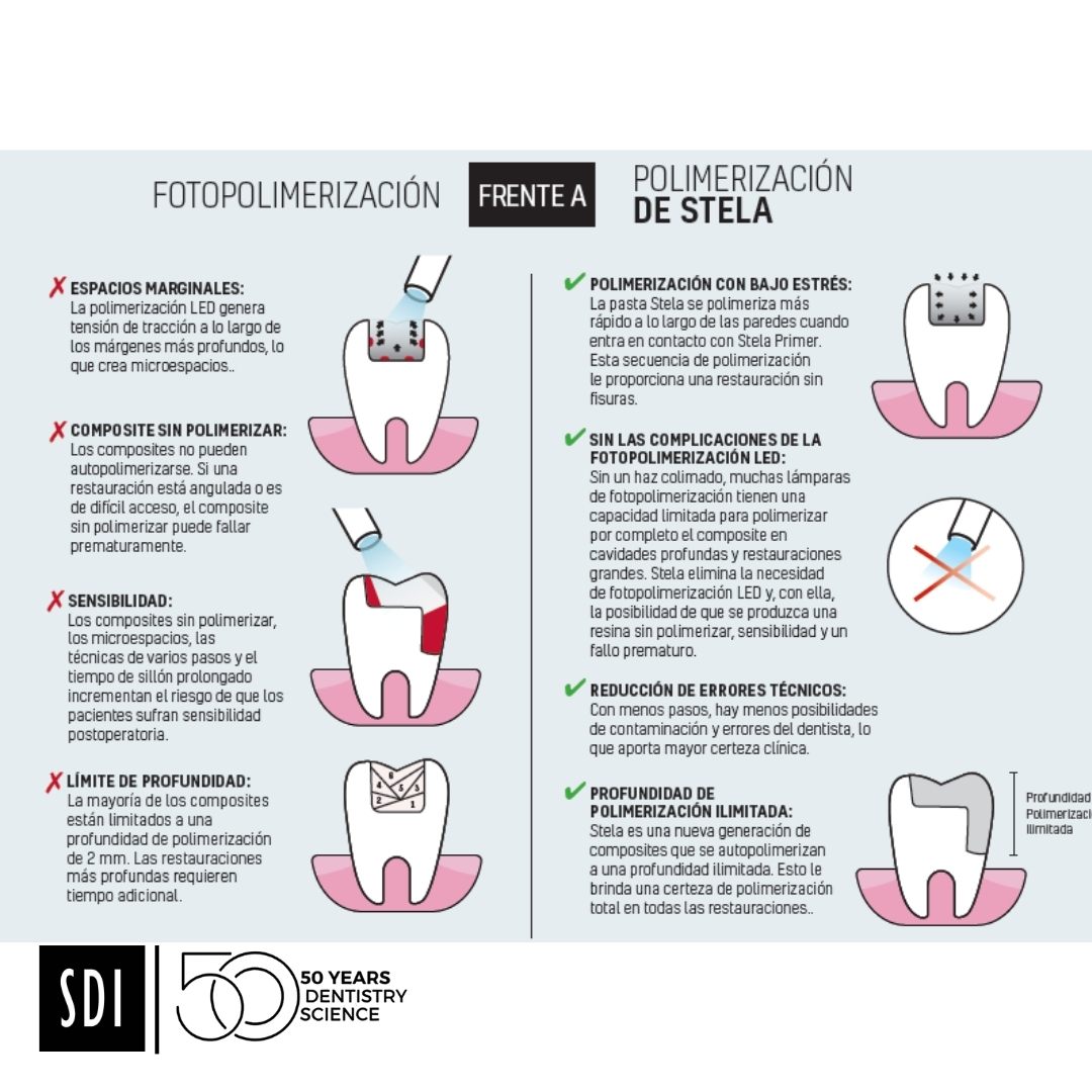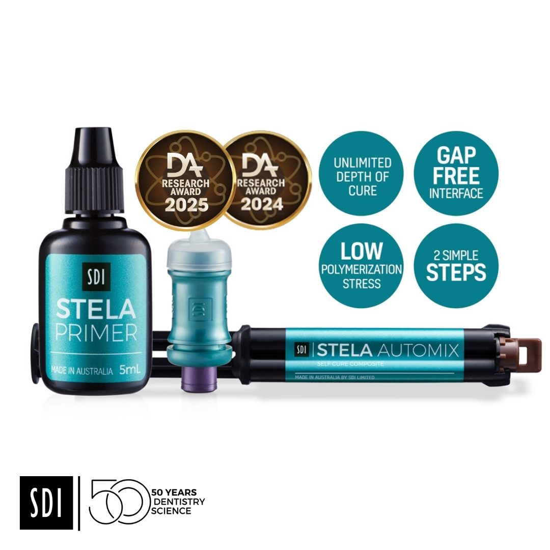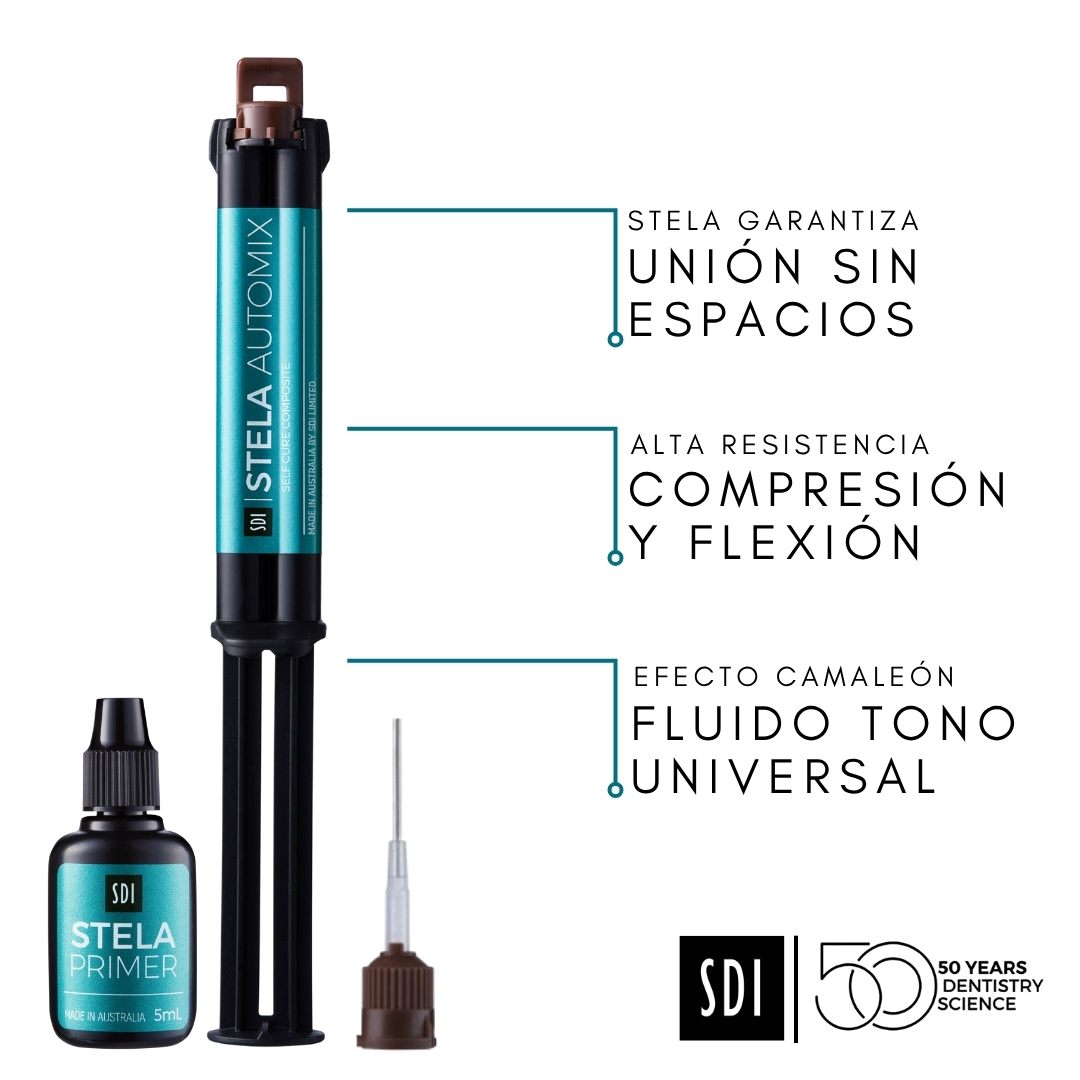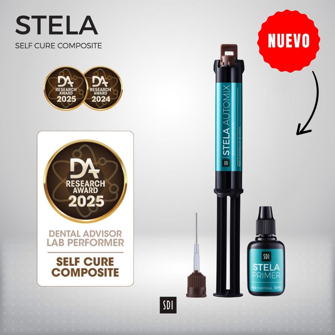 Stela Composite Bulk Fill Fluido Autocurado SDI es un innovador composite autopolimerizable de alto rendimiento. Stela ofrece una profundidad de curado ilimitada y una polimerización de bajo estrés con una interfaz sin espacios. No hay necesidad de grabado ácido o fotopolimerización.